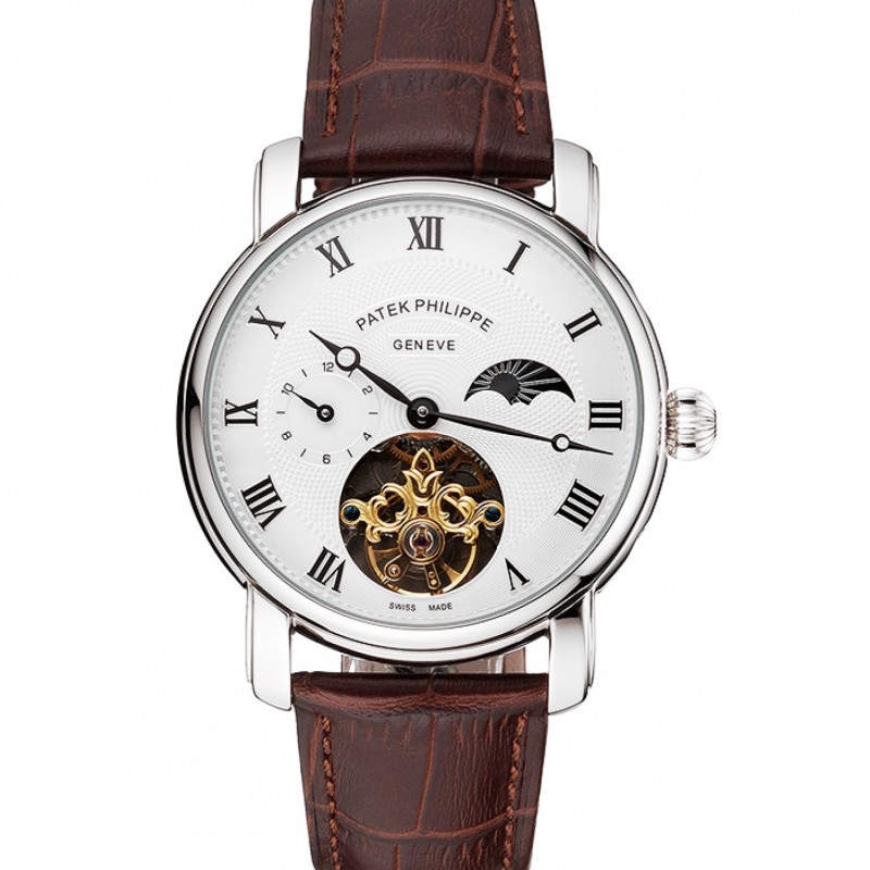 Gama alta Réplicas Relojes Las complicaciones Fase lunar Patek Philippe Tourbillon esfera blanca correa de cuero caja de acero inoxidable de Brown