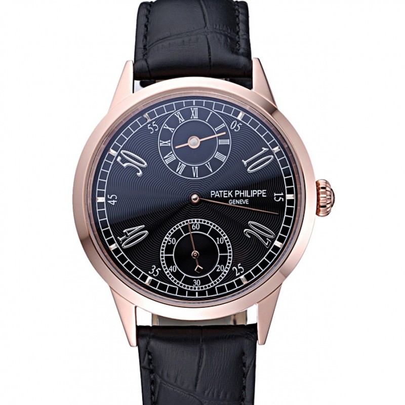 Patek Philippe Geneve Dos Dial Negro Dial de oro rosa Bisel Negro banda de cuero 622146