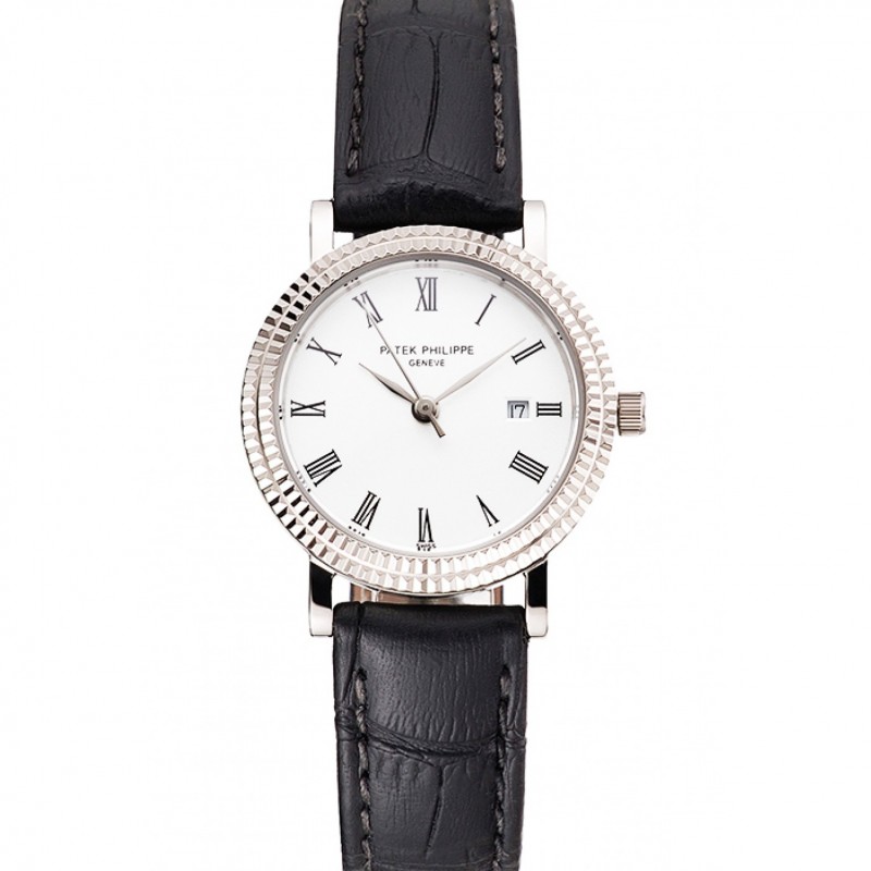 Patek Philippe Blanco Dial correa de cuero de los números romanos de doble bisel acanalado caja de acero inoxidable Negro