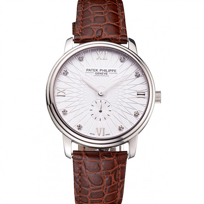 Barato Patek Philippe Fecha grabada en relieve blanco Dial correa de cuero caja de acero inoxidable de Brown