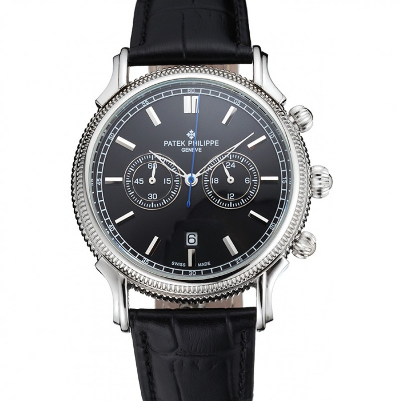 Patek Philippe Cronógrafo Negro Dial correa de cuero caja de acero inoxidable Negro