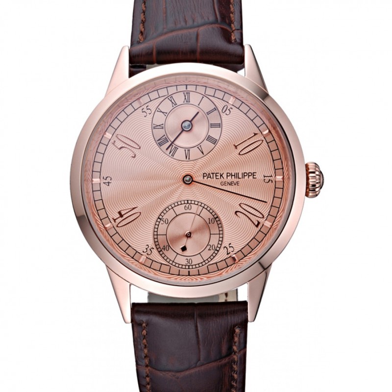 Alta calidad Patek Philippe Geneve Dos línea rosa Dial de oro rosa Bisel Brown banda de cuero 622149