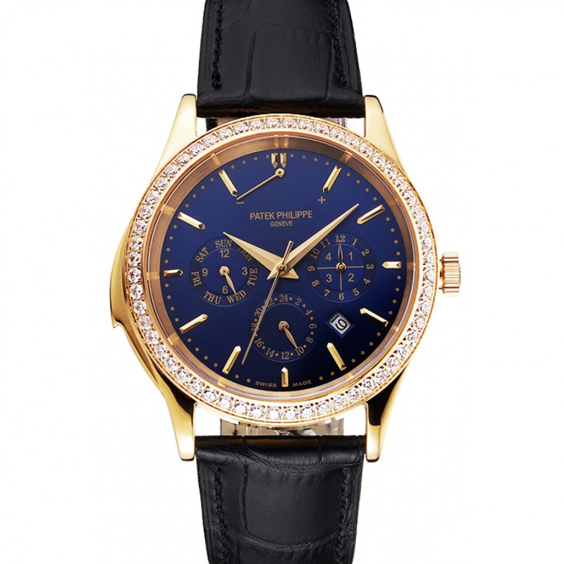 Las complicaciones suizo Patek Philippe calada Dial correa de cuero Bisel De Oro Diamante Negro