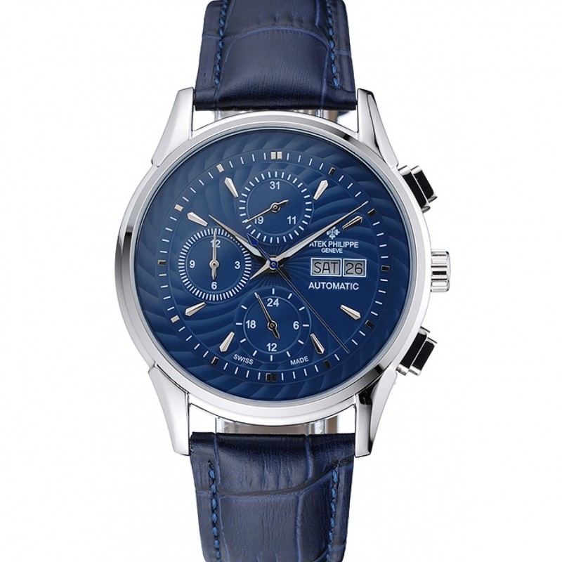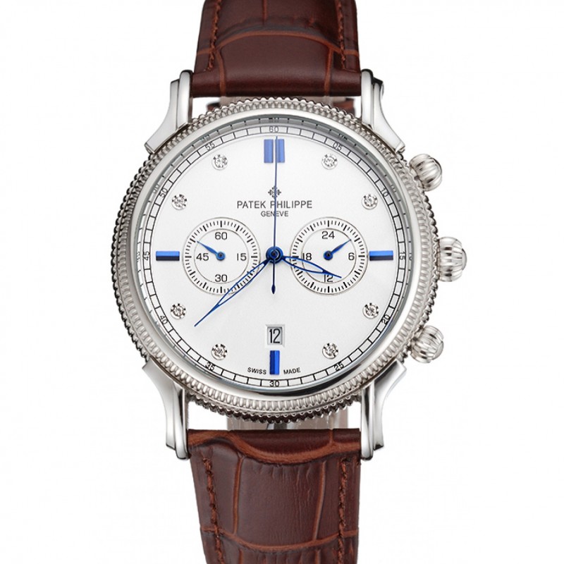 Patek Philippe cronógrafo esfera blanca con el diamante y la correa de cuero azul Marcas caja de acero inoxidable de Brown