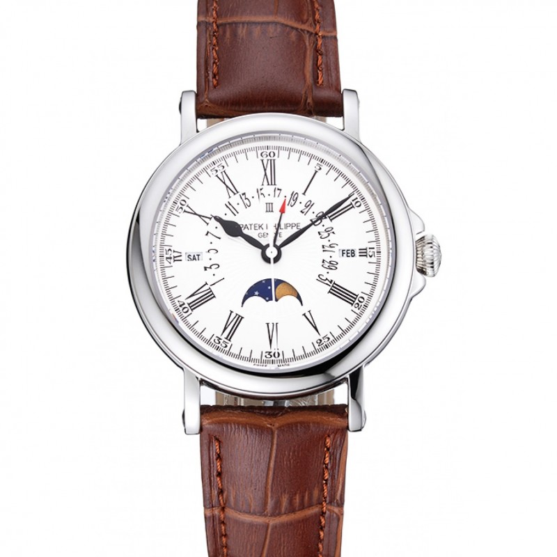 Lujo Réplicas Relojes Patek Philippe Calendario Perpetuo retrógrada Fecha esfera blanca de plata del caso Brown pulsera de cuero 1454149