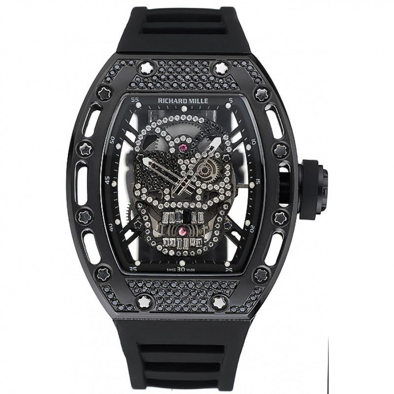 Barato Richard Mille Tourbillon RM 052 cráneo pulsera de goma de la caja Negro Negro 1454260