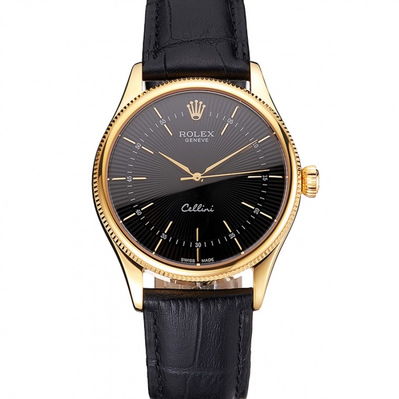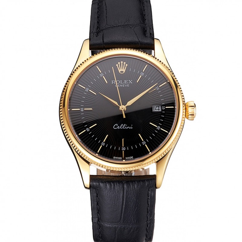 Suiza Rolex Cellini Negro Dial correa de cuero del oro Marcas Caja Oro Negro