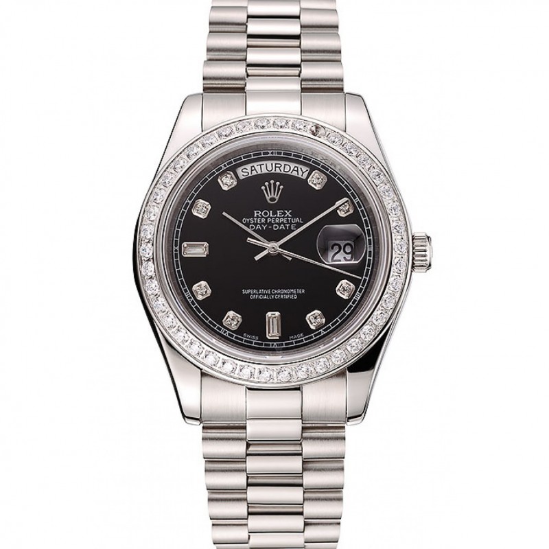 Alta calidad Réplicas Relojes Suiza Rolex Day-Date Negro Dial caja del diamante diamante numerales pulsera de acero inoxidable 1453966