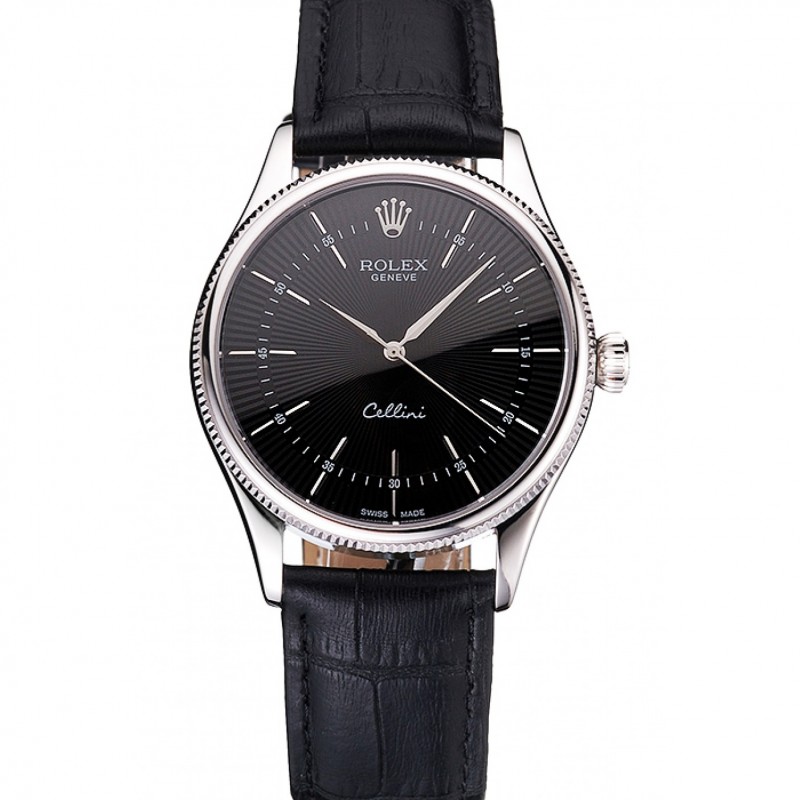 Suiza Rolex Cellini Negro Dial correa de cuero de la caja de acero Negro