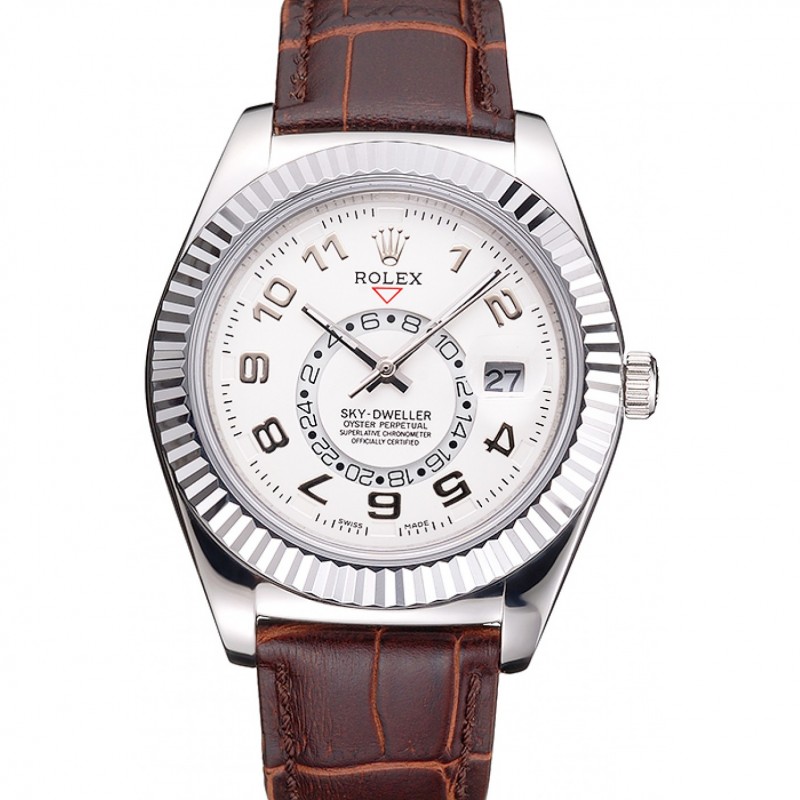 Rolex Sky Dweller Blanco Dial correa de cuero caja de acero inoxidable de Brown