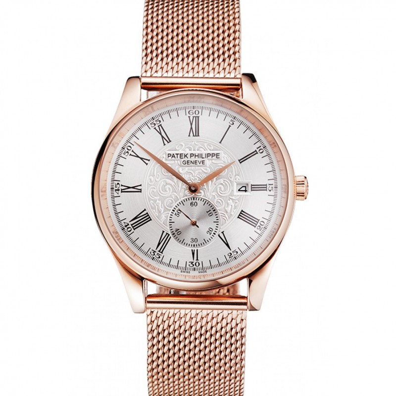 AAA Réplicas Relojes Patek Philippe Calatrava pequeños segundos grabada plata Dial Caja de oro rosa y pulsera