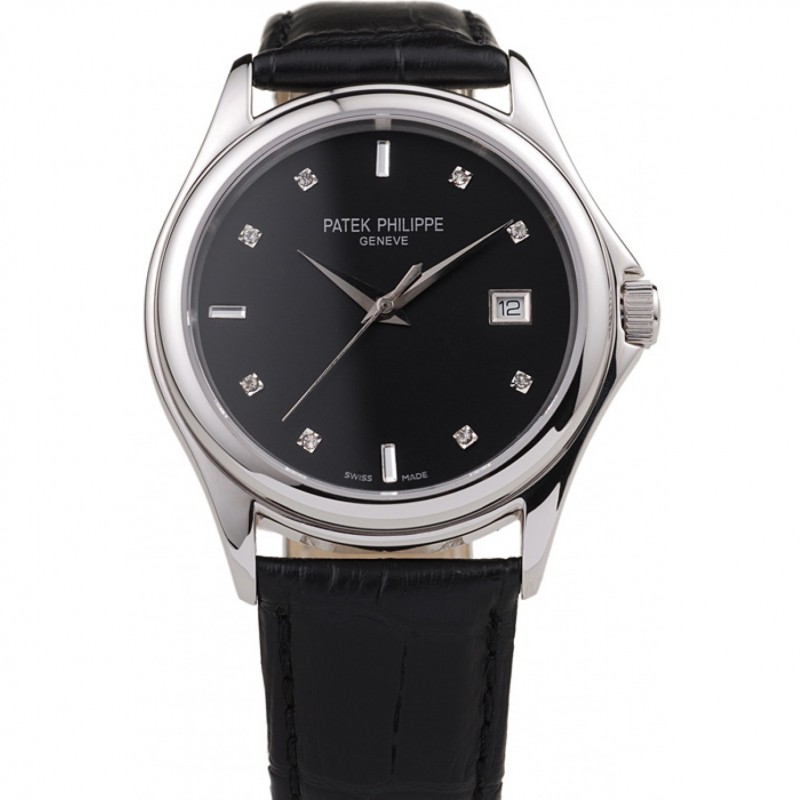 Alta calidad Réplicas Relojes Patek Philippe Geneve Calatrava tachonado cristal horas Marcador Negro Dial correa de cuero Negro 98170