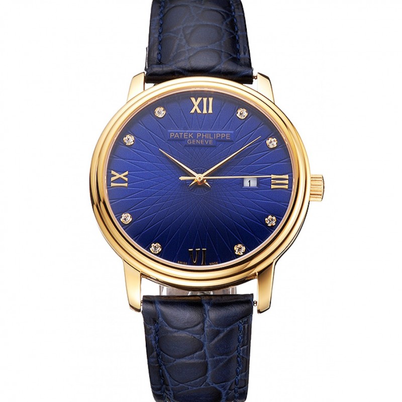 SS Réplicas Relojes Patek Philippe Fecha azul en relieve Dial correa de cuero de la caja del oro azul