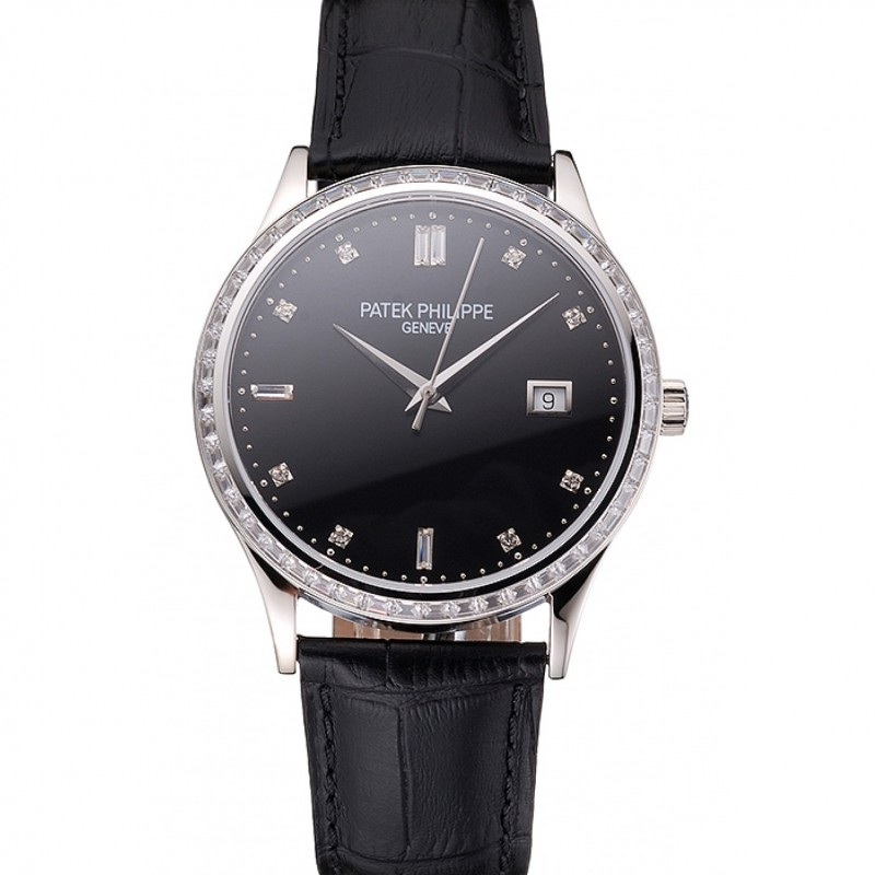 Patek Philippe Geneve Calatrava tachonado cristal horas Marcador Negro Dial correa de cuero Negro 98169