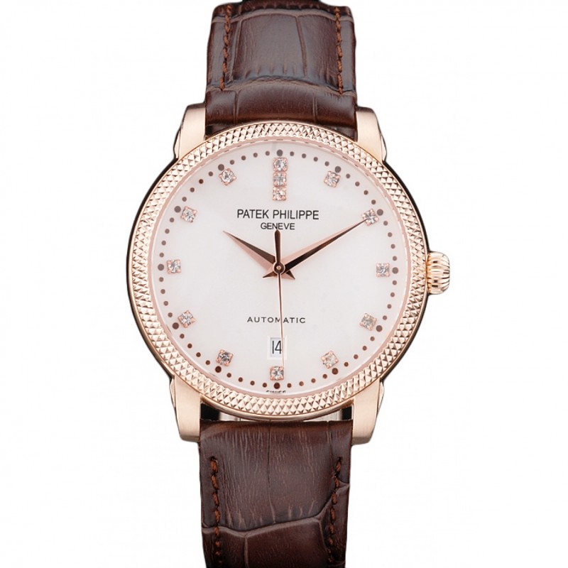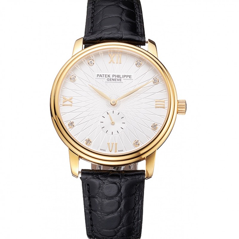 Patek Philippe Esfera Blanca, Correa de cuero del diamante marcas de la hora doble acanalado Bisel Caja Oro Negro