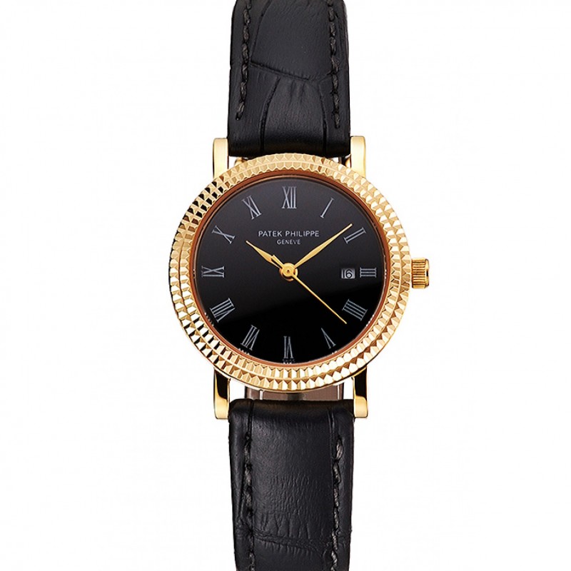 Patek Philippe Negro Dial correa de cuero de los números romanos de doble bisel acanalado Caja Oro Negro