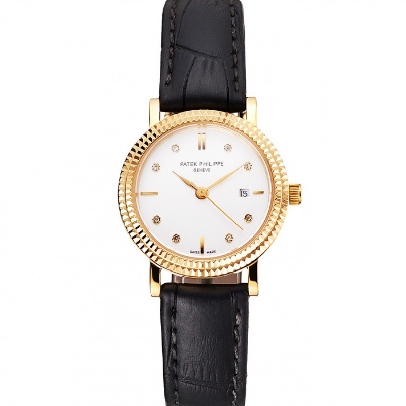 Patek Philippe grabada en relieve blanco Dial correa de cuero de la caja Negro Oro