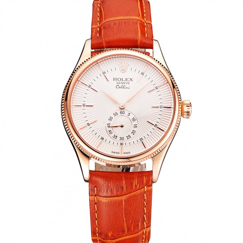 Suiza Rolex Cellini Blanco Dial correa de cuero de la caja de oro rosa marrón claro