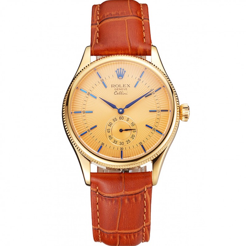 Suiza Rolex Cellini Oro Dial correa de cuero azul Marcas Caja Oro marrón claro