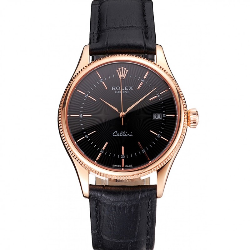 Suiza Rolex Cellini Fecha Negro Dial correa de cuero de oro rosa Marcas Caja Oro Rosa Negro