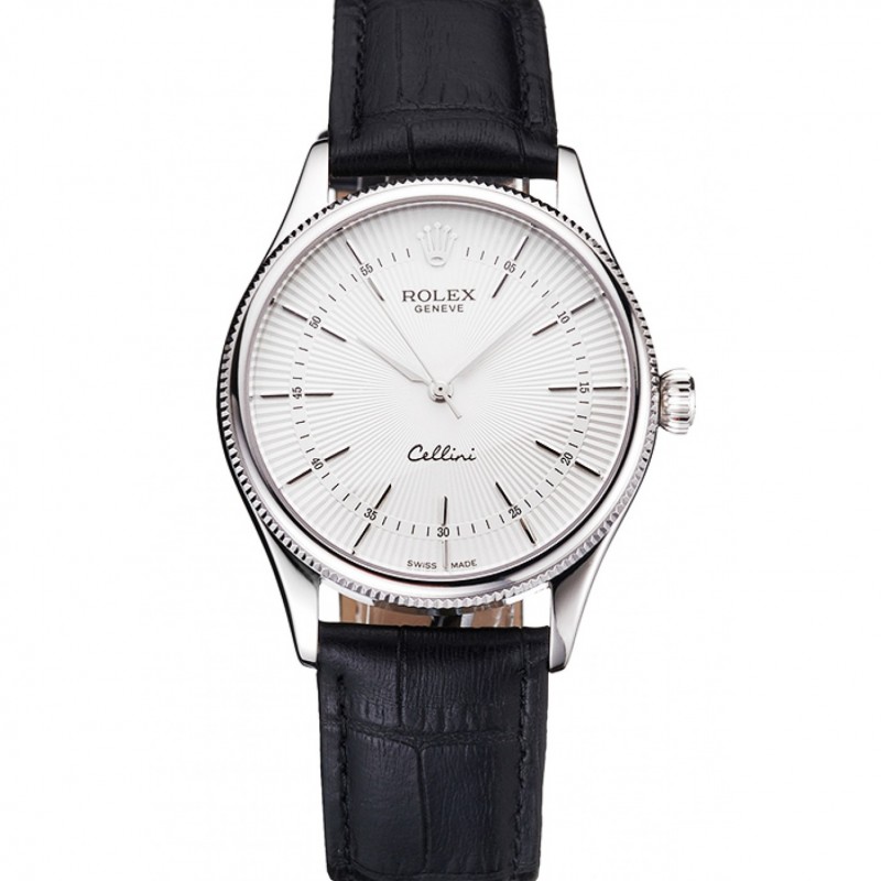 Suiza Rolex Cellini blanca Guilloche Dial correa de cuero caja de acero inoxidable Negro