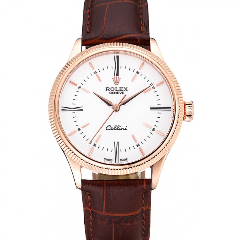 Suiza Rolex Cellini Blanco Dial correa de cuero de los números romanos de oro rosa Marrón Luz