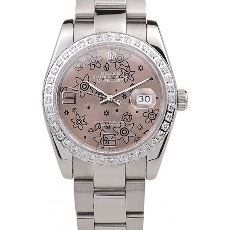 Mejor Rolex Datejust acero inoxidable pulido Flores Brown Dial Diamante plateado