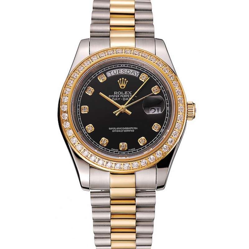 Suiza Rolex Day-Date Negro Dial caja del diamante de oro dos tonos pulsera de acero inoxidable 1453975