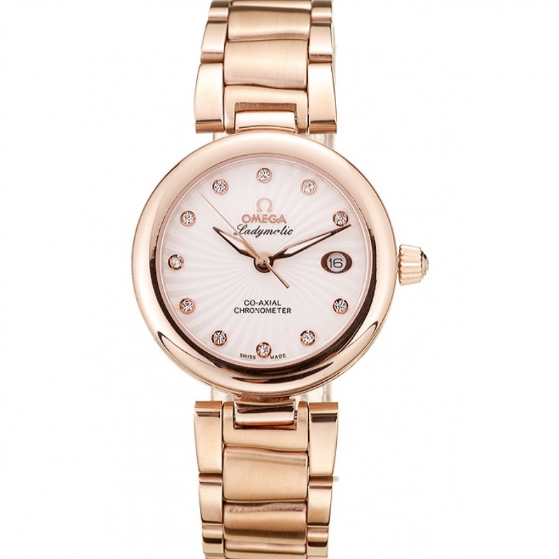 Dial Omega DeVille Ladymatic de oro rosa de acero inoxidable correa blanca