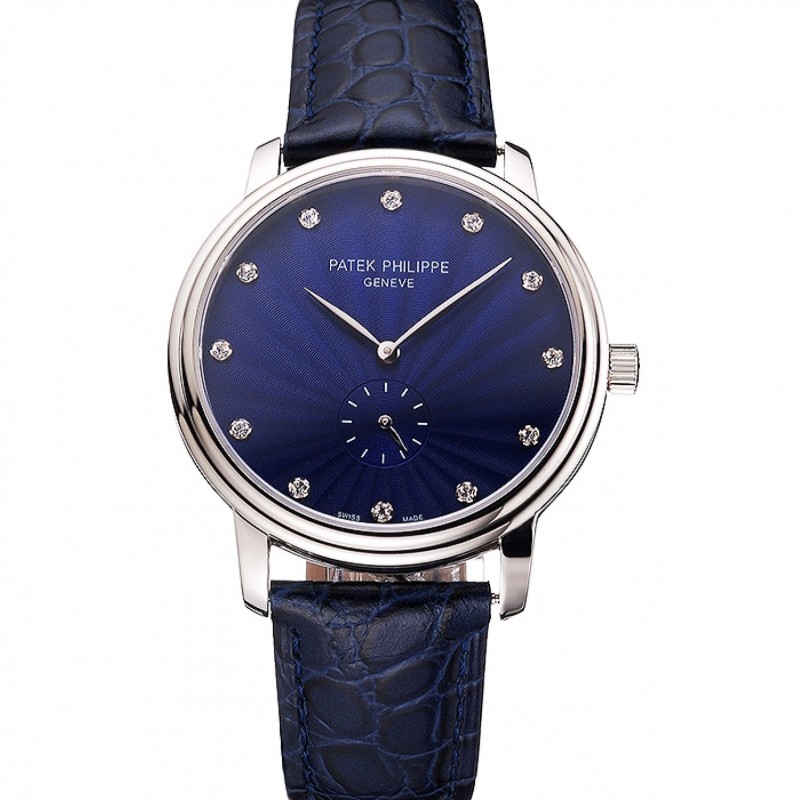 Mejor Patek Philippe azul Guilloche Dial correa de cuero caja de acero inoxidable Azul
