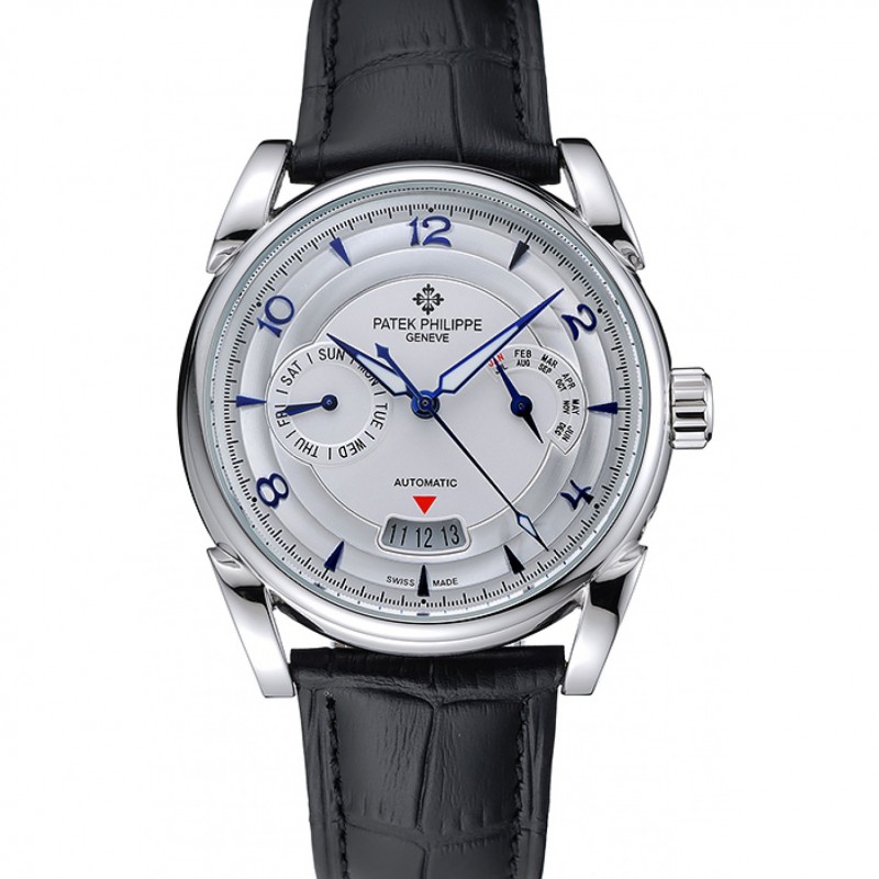 AAA Réplicas Relojes Las complicaciones Patek Philippe cronógrafo Esfera Blanca Caso de plata pulsera de cuero Negro 1454237