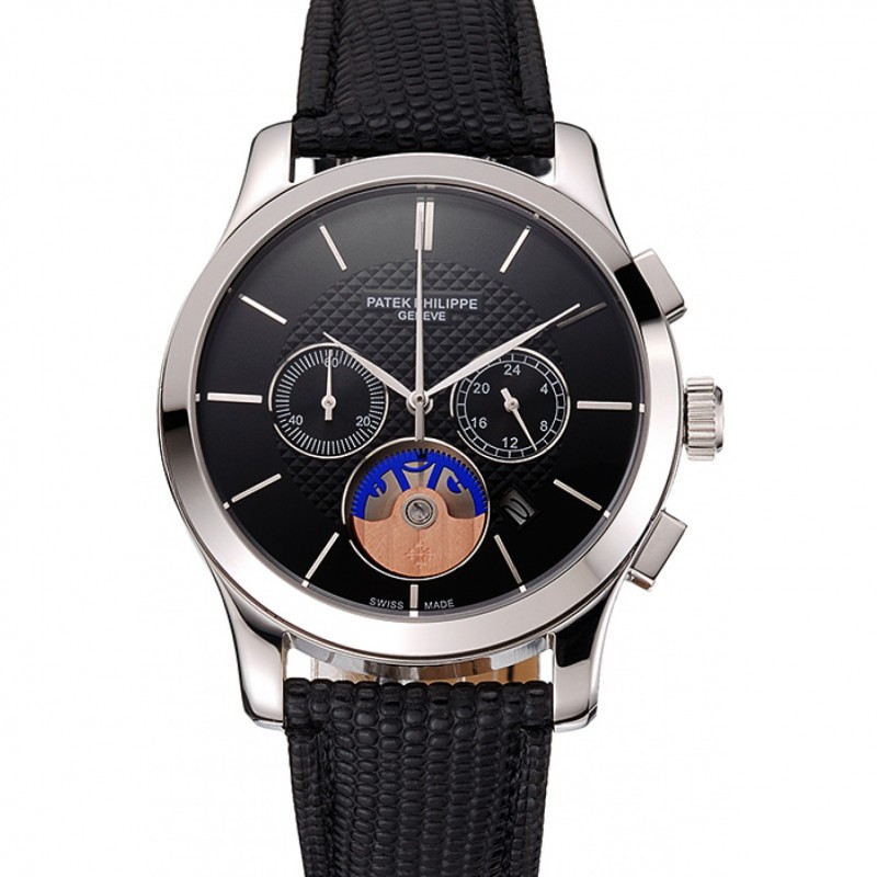 Patek Philippe Cronógrafo Negro Dial correa de cuero caja de acero inoxidable Negro