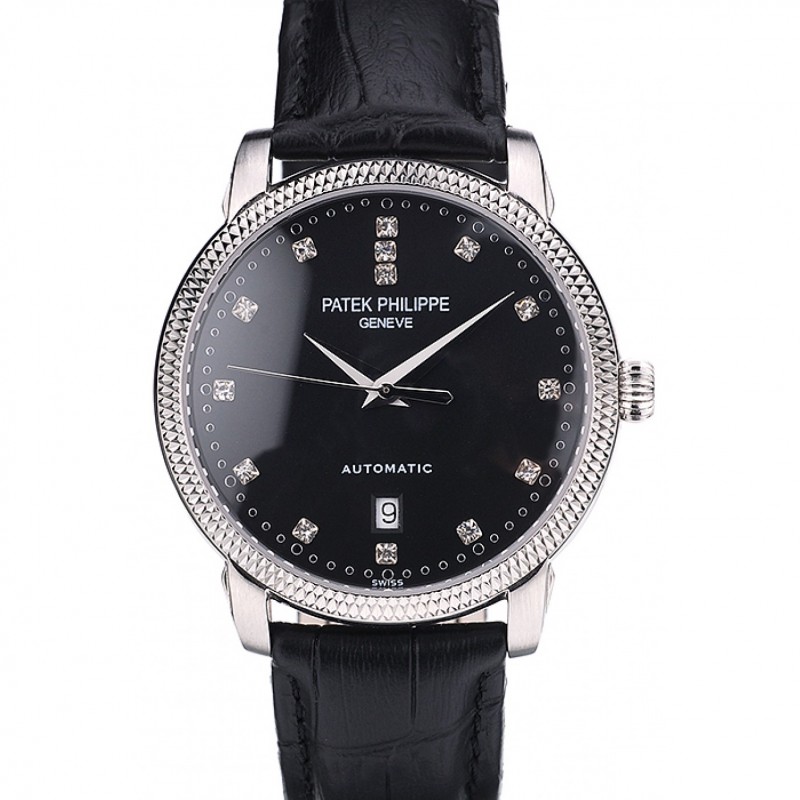 Barato Patek Philippe Calatrava suiza acanalado Bisel Negro Dial correa de cuero Negro 7661