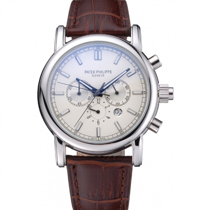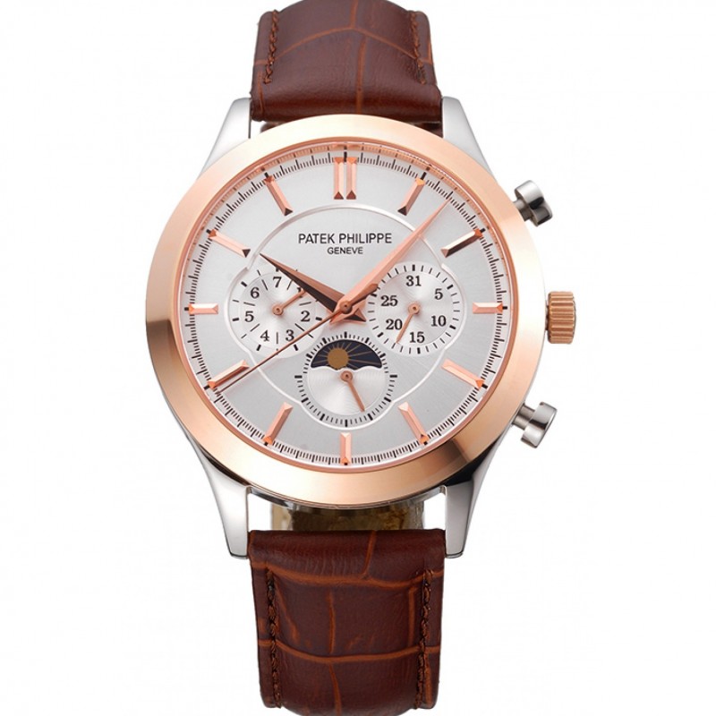 Patek Philippe Fase lunar Cronógrafo Esfera Blanca Caja de oro Correa de cuero marrón 622843