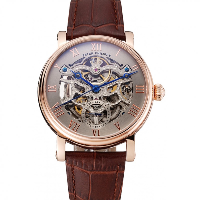 Patek Philippe Grand complicaciones Gris Dial Esqueleto de oro rosa caja Brown correa de cuero 1453807