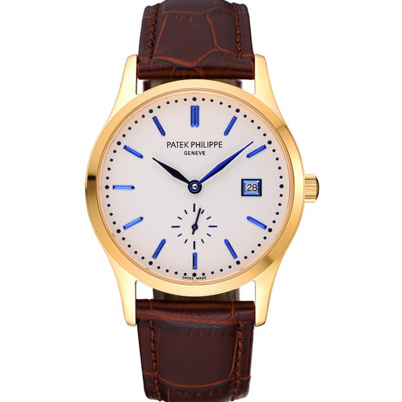 Patek Philippe Esfera Blanca Caja de oro Correa de cuero marrón 622844