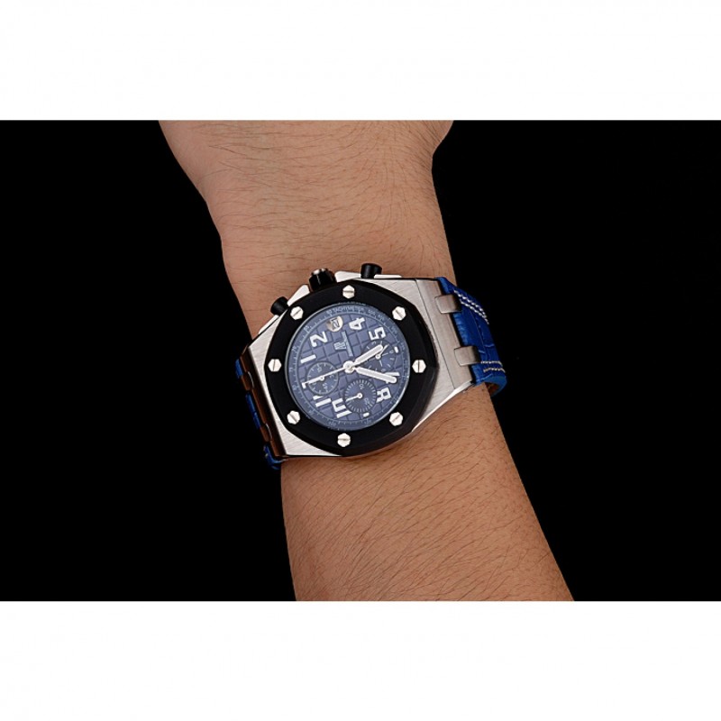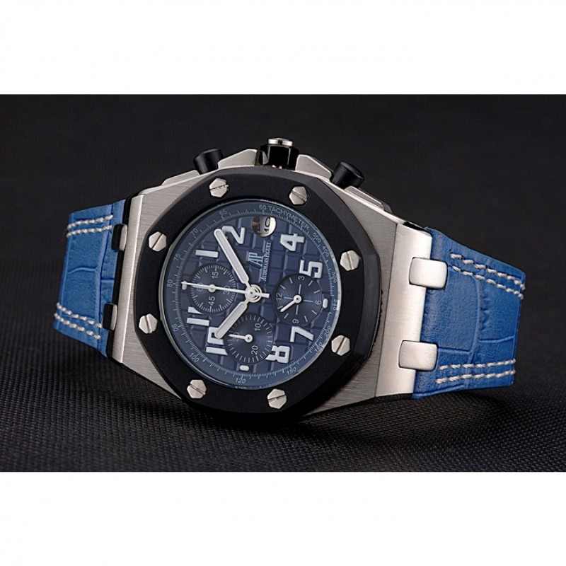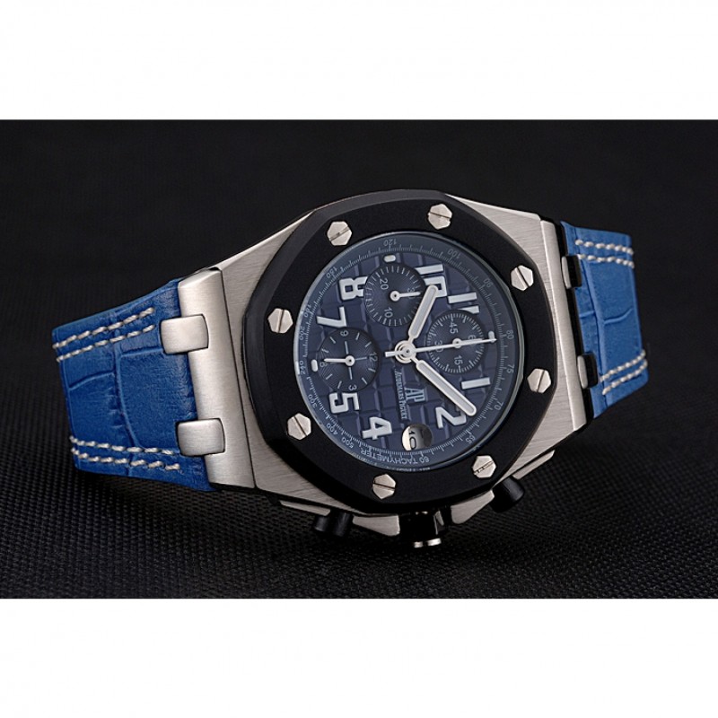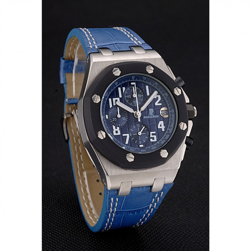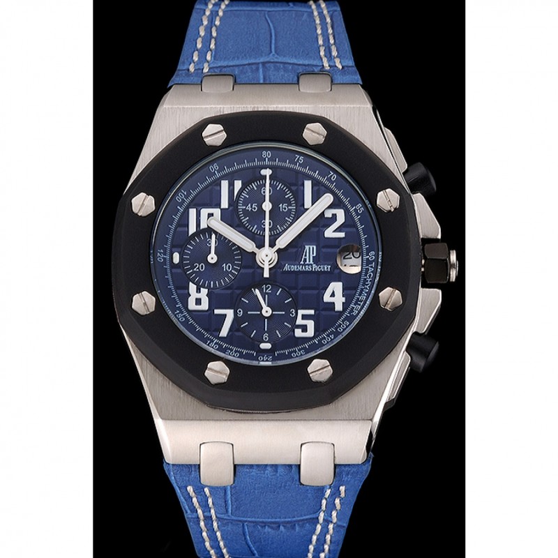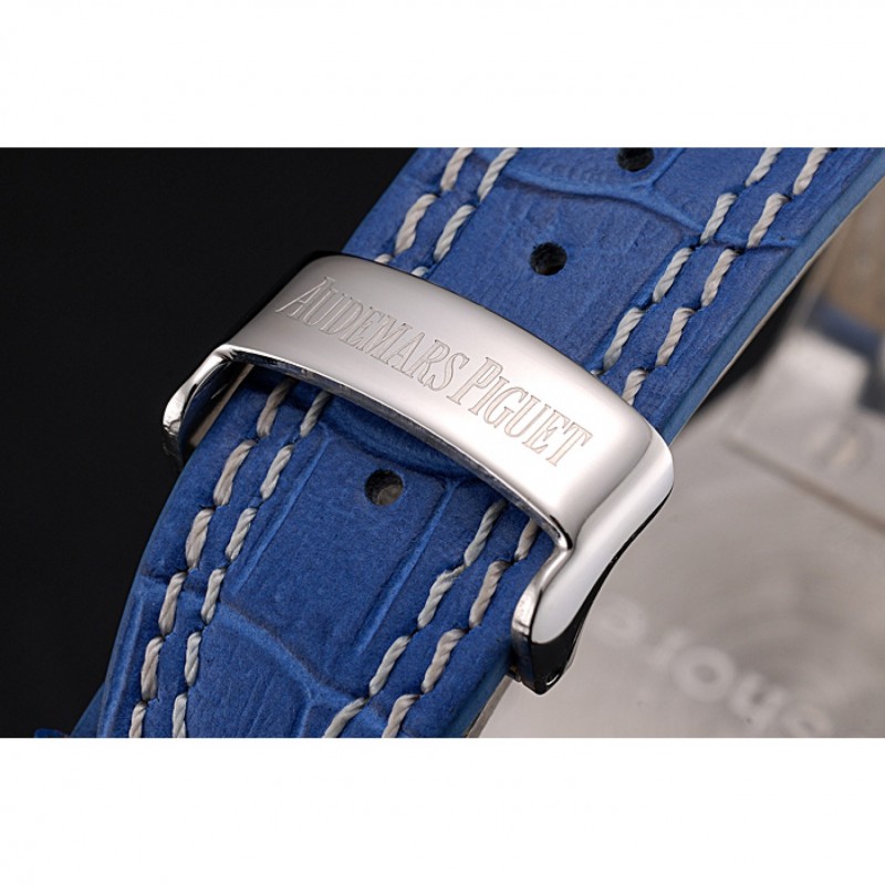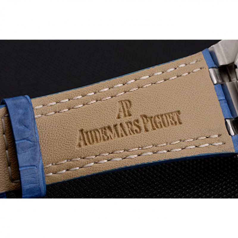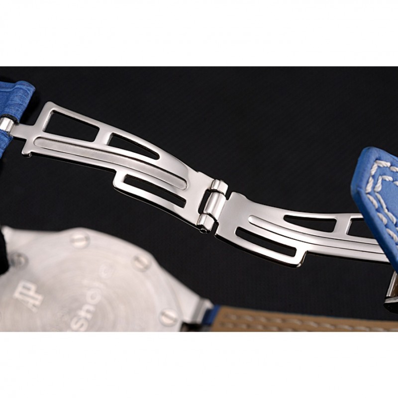 pulsera: correa de piel de cocodrilo azul con costura doble blanco y en relieve de calor nombre de Audemars Piguet y el logotipo y un Audemars Piguet inscrito acero inoxidable flip-sobre el gancho del corchete