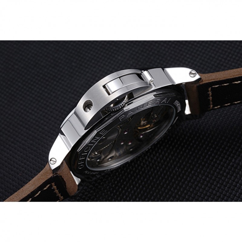 Volver: de acero inoxidable cepillado complemento en la parte trasera con la mecánica revelando centro y grabados Officine Panerai