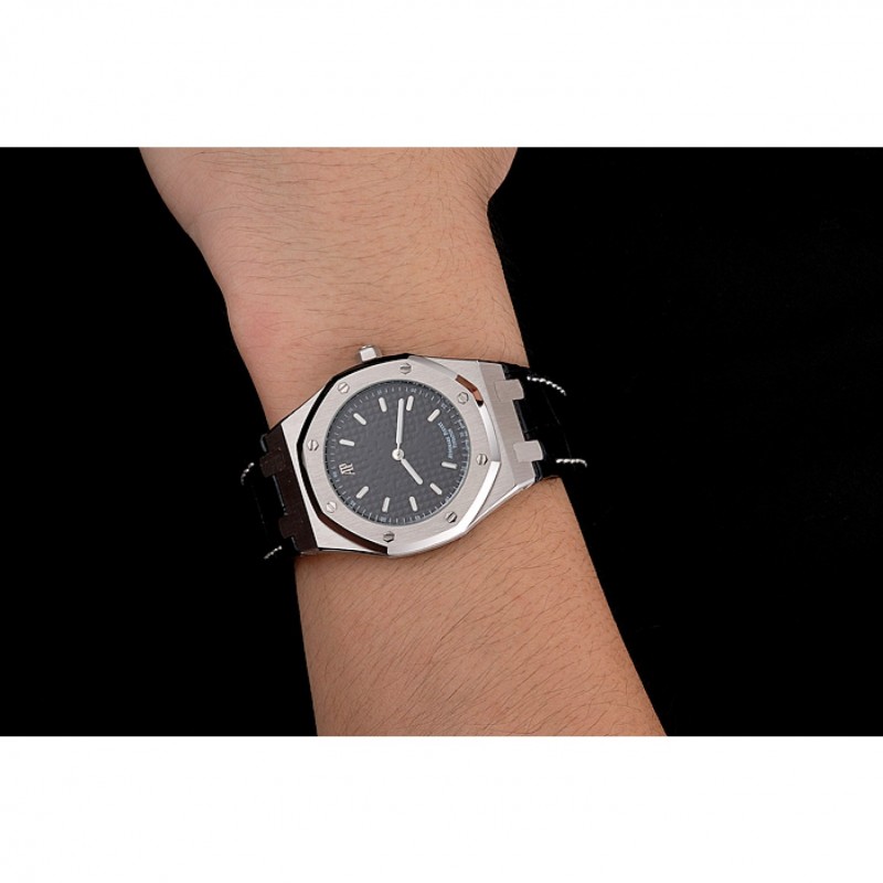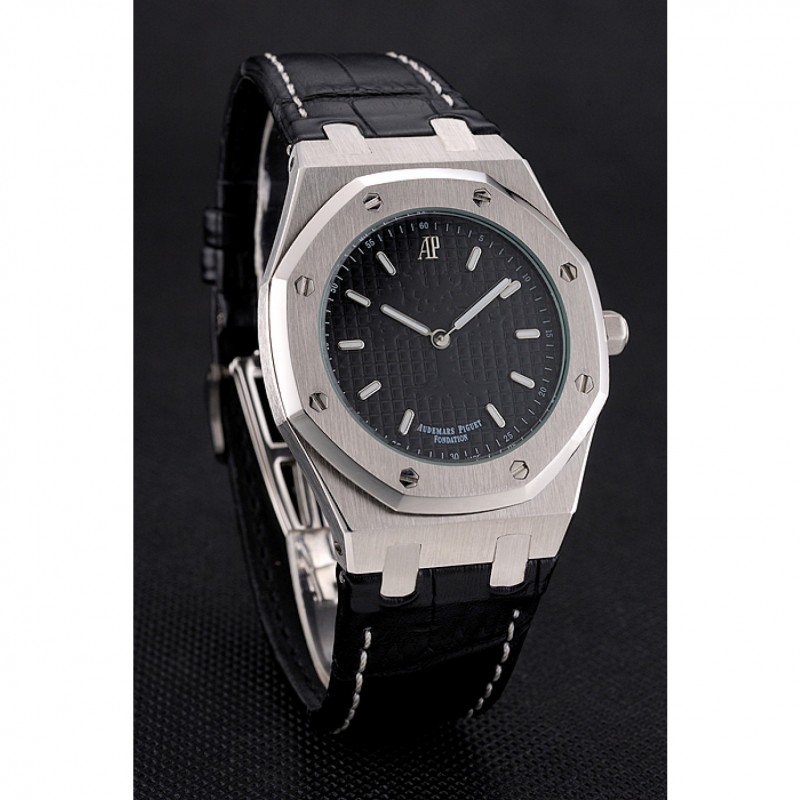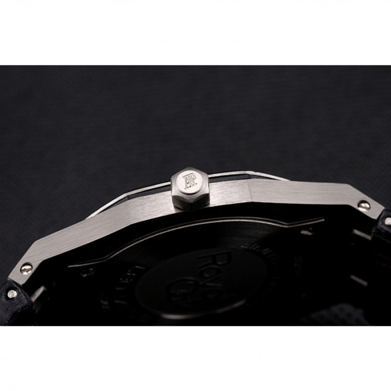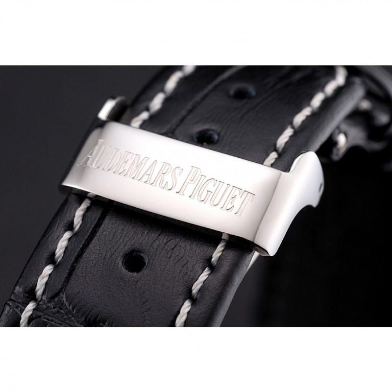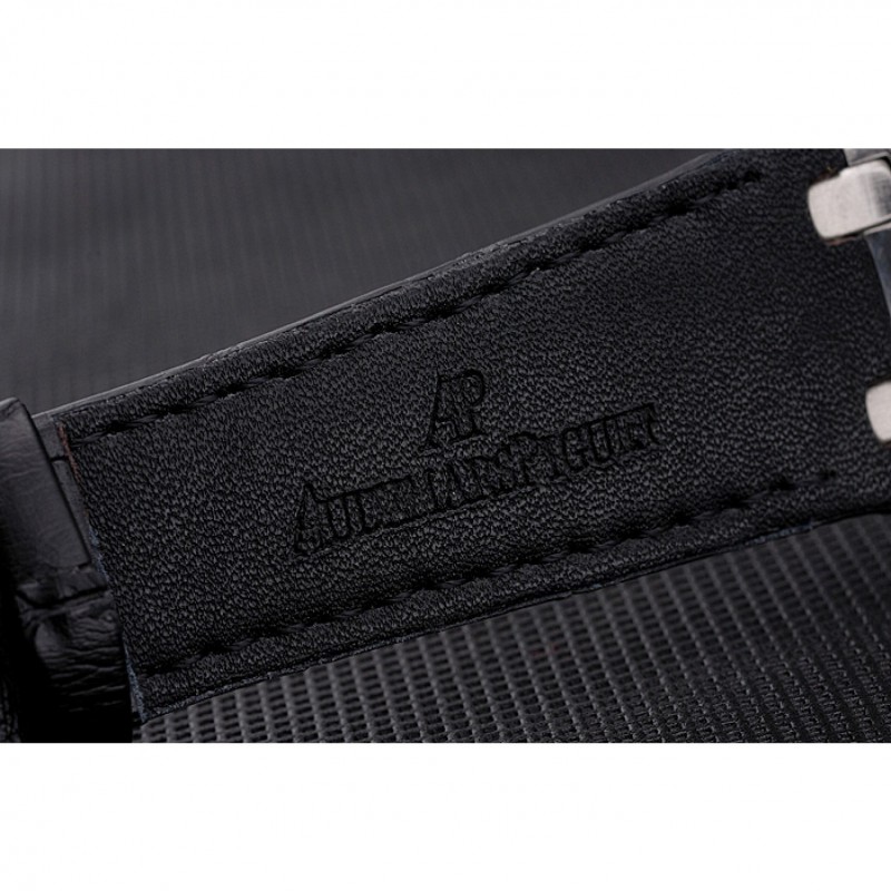 pulsera: logo y Audemars Piguet calor correa de piel de cocodrilo negro en relieve con la costura de hilo blanco y Audemars Piguet grabado de acero inoxidable pulido plegable en cierre de broche de gancho
