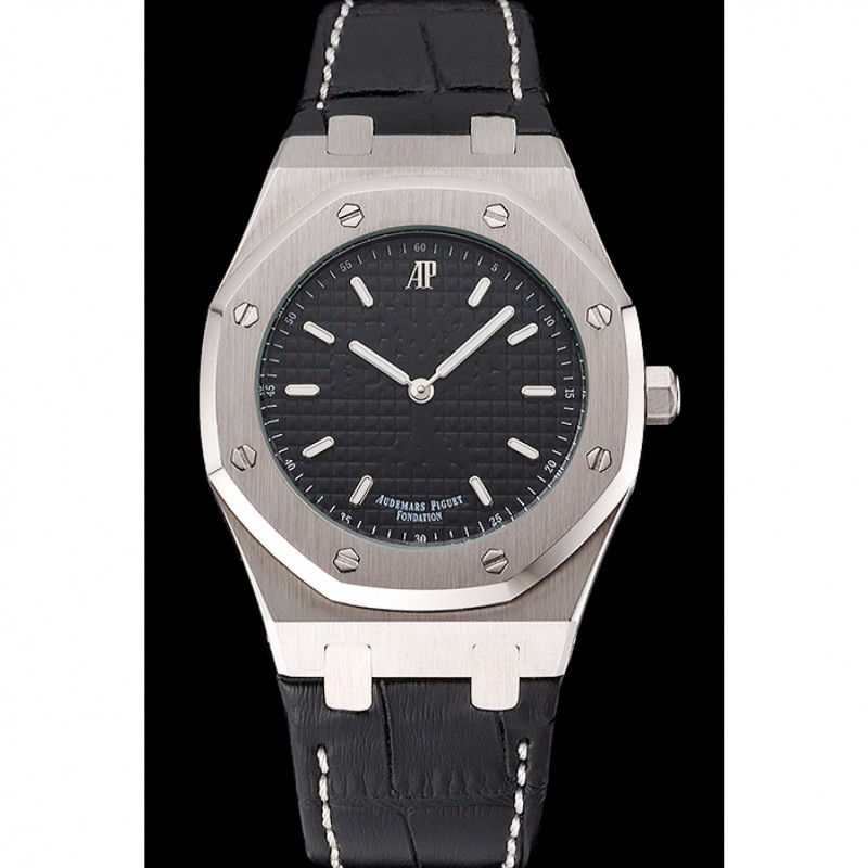 Audemars Piguet Royal Oak Fondation Negro Dial correa de cuero caja de acero inoxidable Negro
