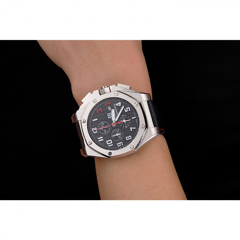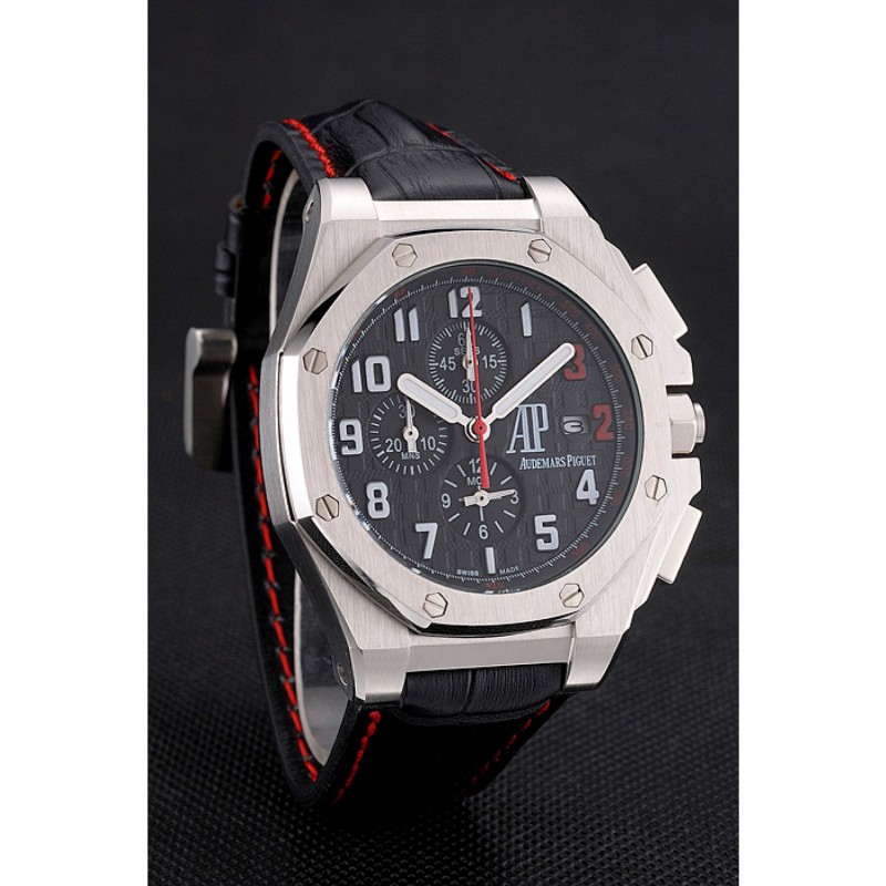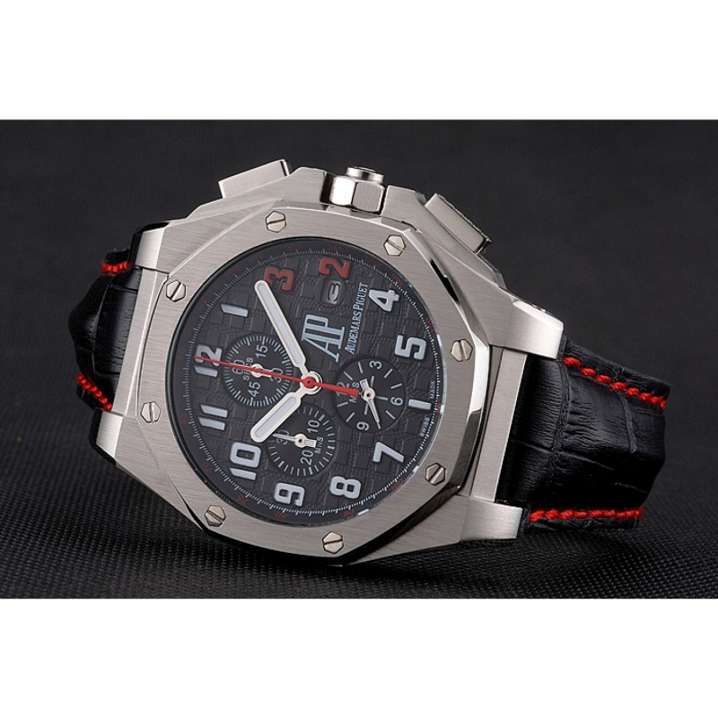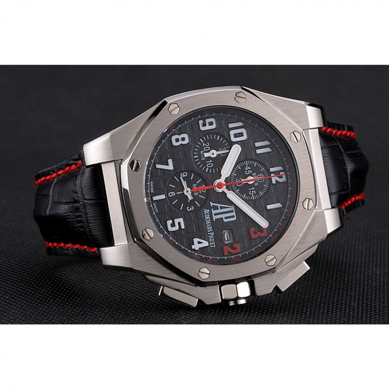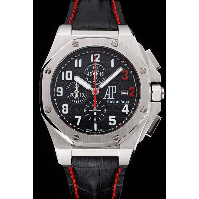 pulsera: Audemars Piguet y correa de cuero de calor logotipo en relieve de cocodrilo negro con costuras de hilo rojo y logo Audemars Piguet grabado acero inoxidable cepillado de gancho hebilla de cierre