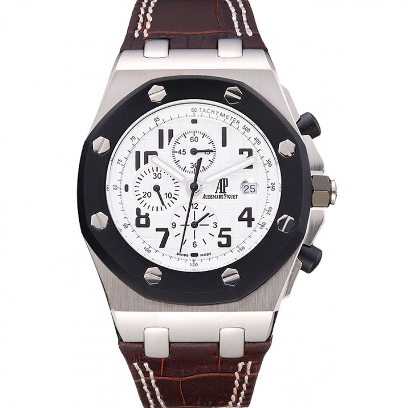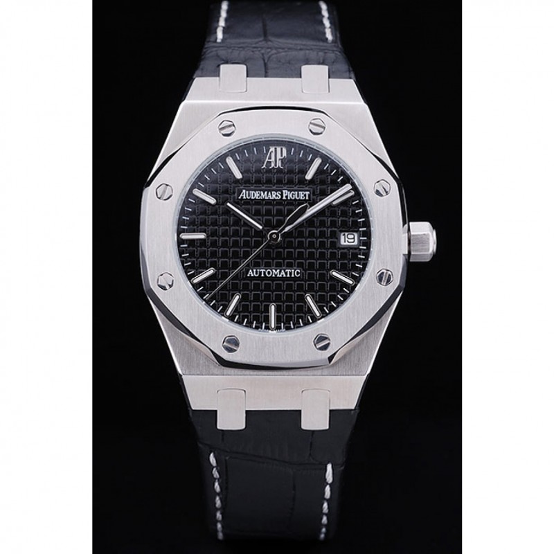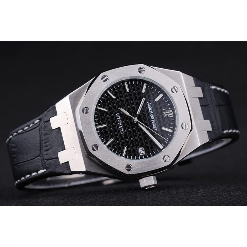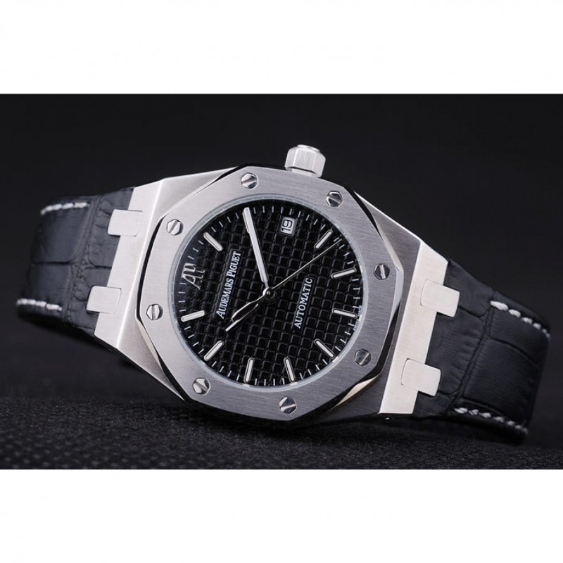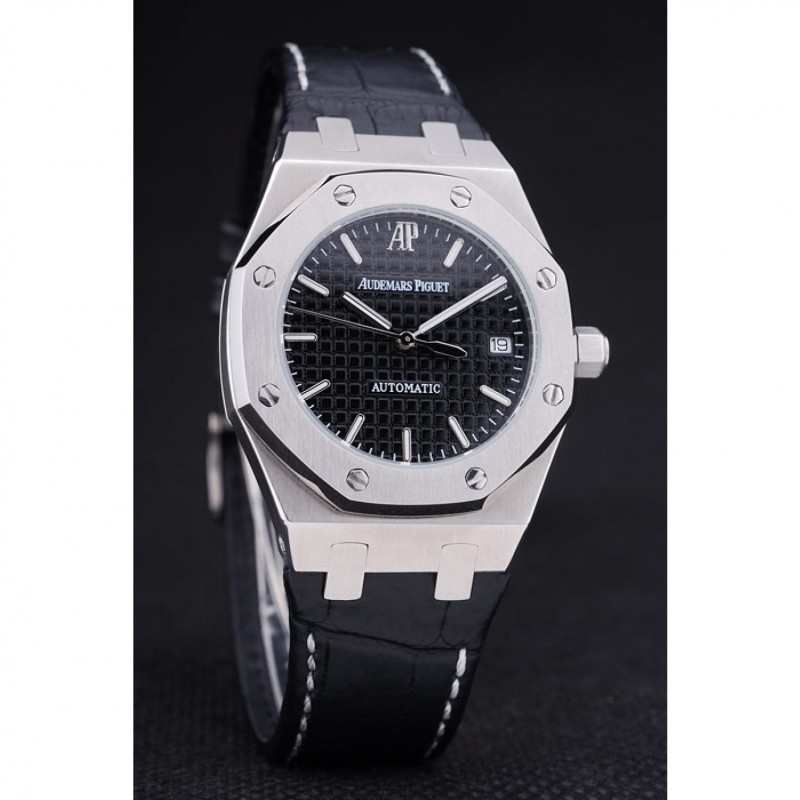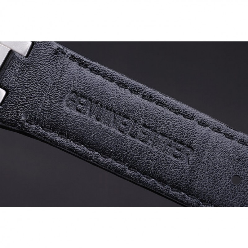 pulsera: cocodrilo Negro correa de cuero con costuras de color blanco hilo y en relieve de calor nombre de Audemars Piguet y el logotipo y un Audemars Piguet inscrito acero abatible sobre el gancho inoxidable cierre