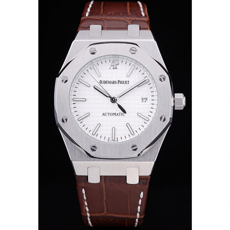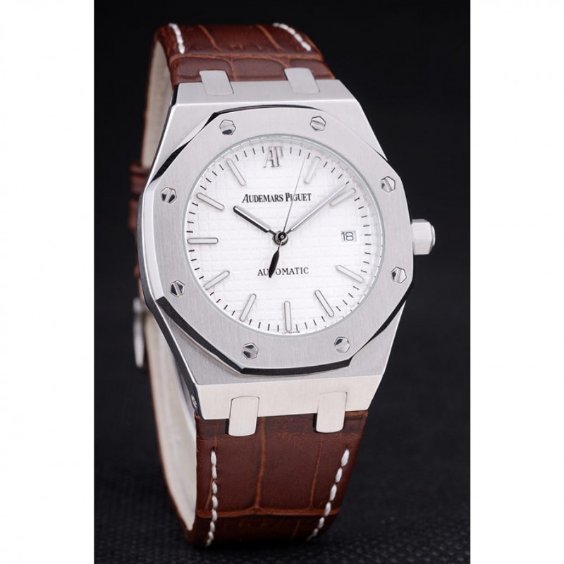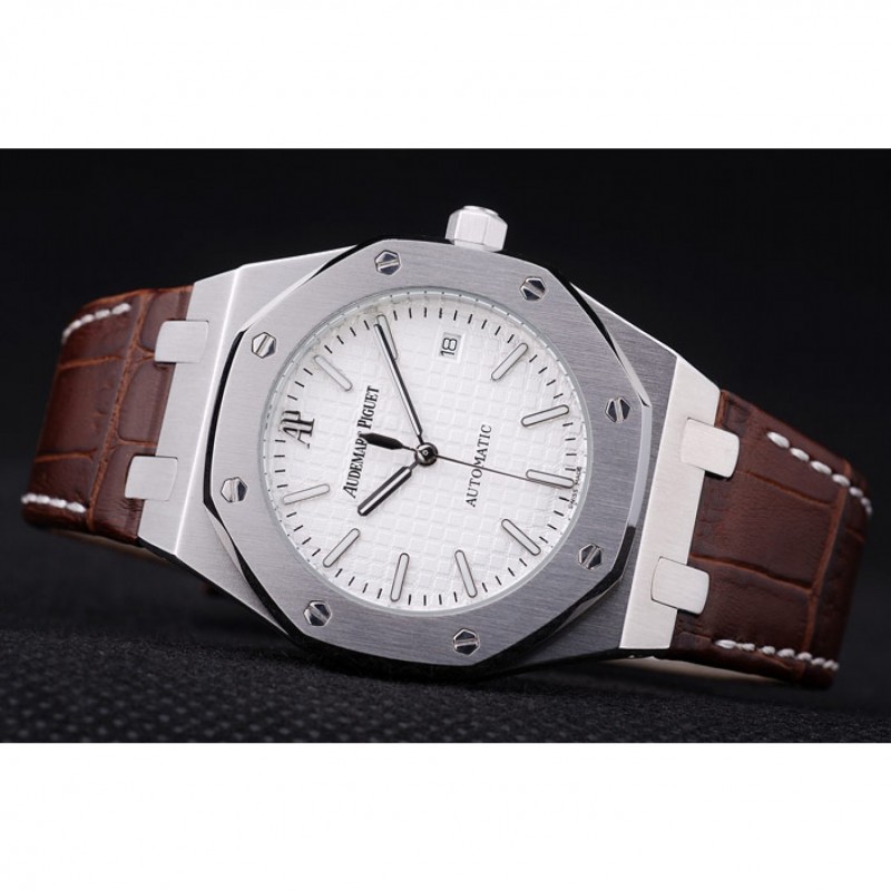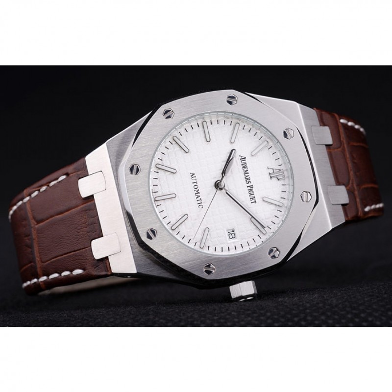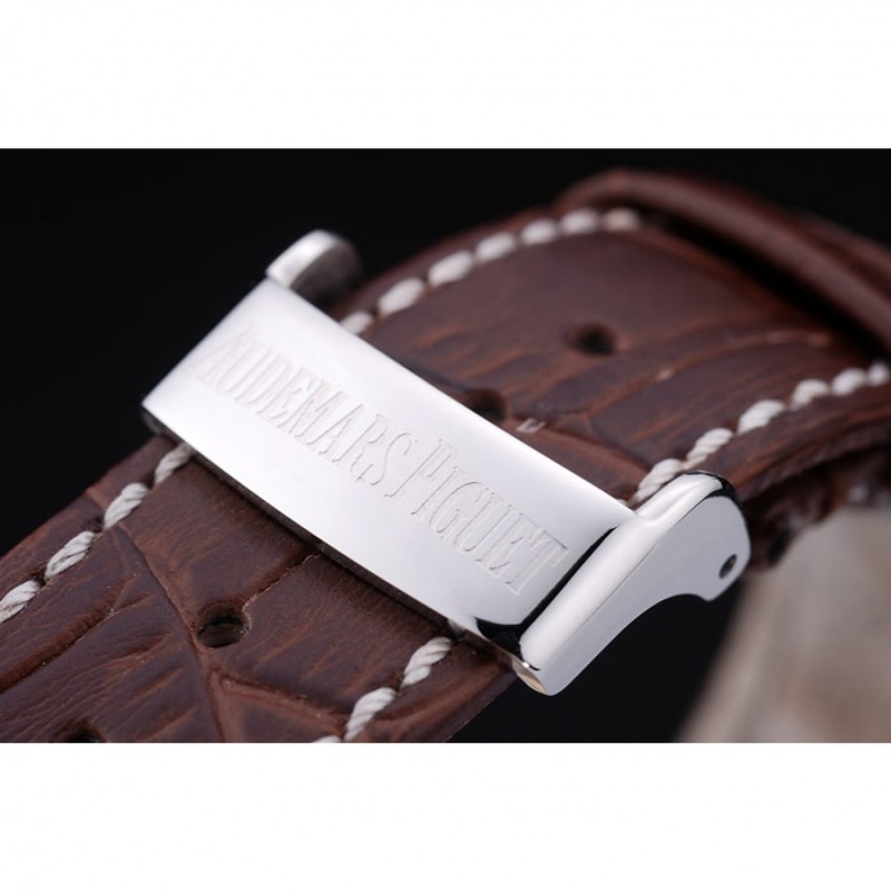 pulsera: cocodrilo Brown correa de cuero con costuras de color blanco hilo y en relieve de calor nombre de Audemars Piguet y el logotipo y un Audemars Piguet inscrito acero abatible sobre el gancho inoxidable cierre