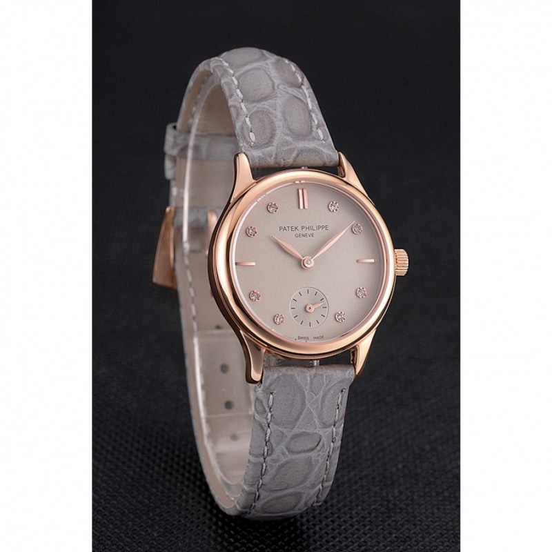 Barato Patek Philippe Gris Dial correa de cuero del diamante Marcas Caja Oro Rosa Gris