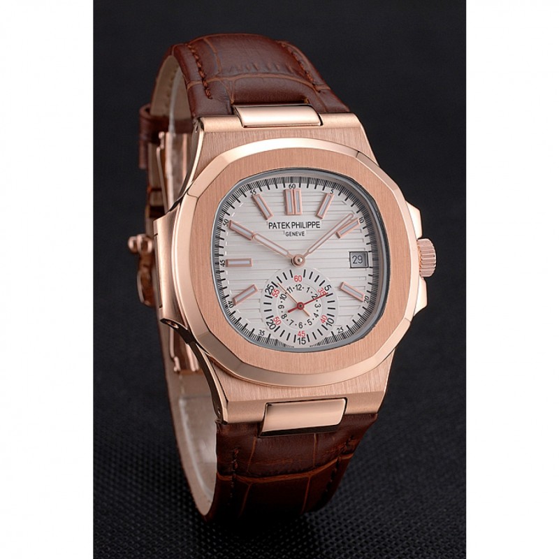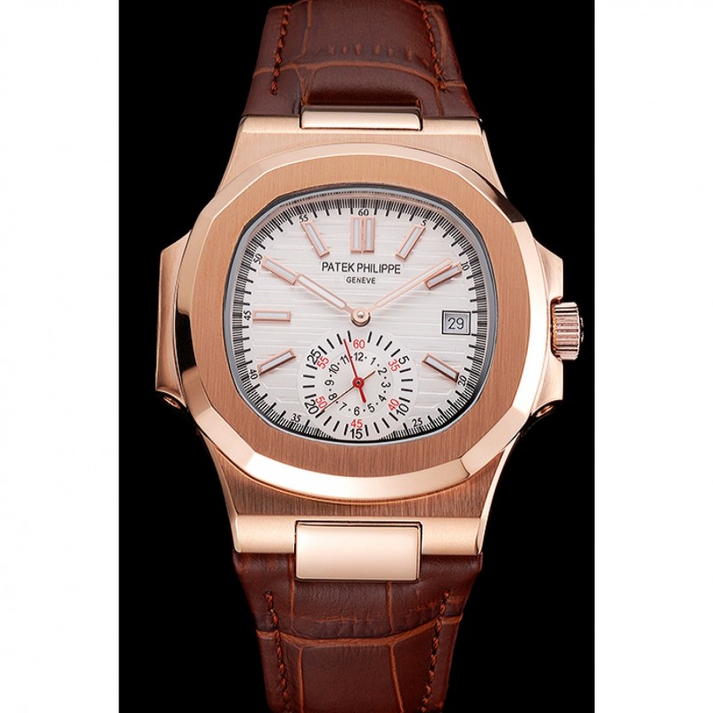 Barato Patek Philippe Nautilus Blanco Dial correa de cuero de la caja de oro rosa Brown