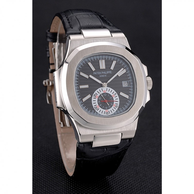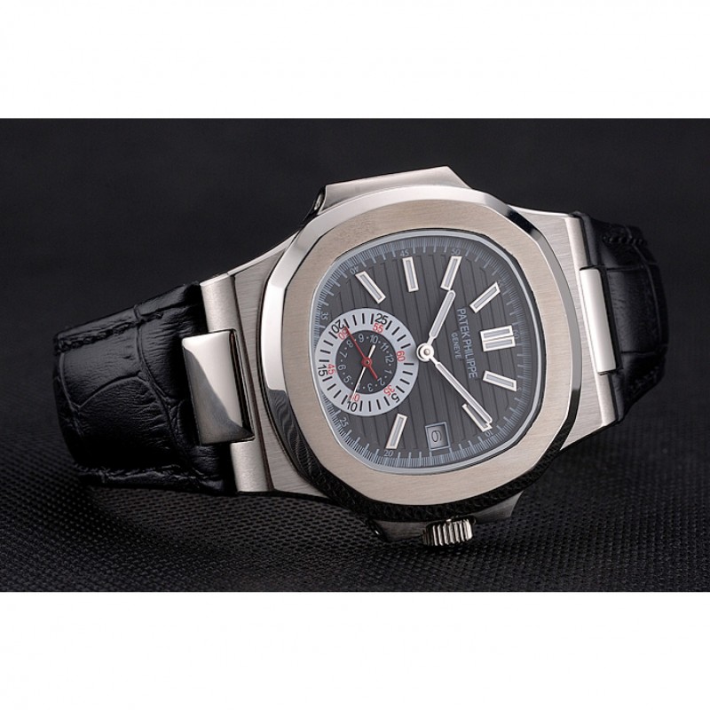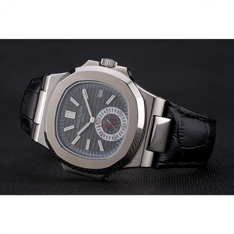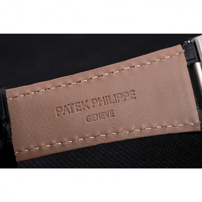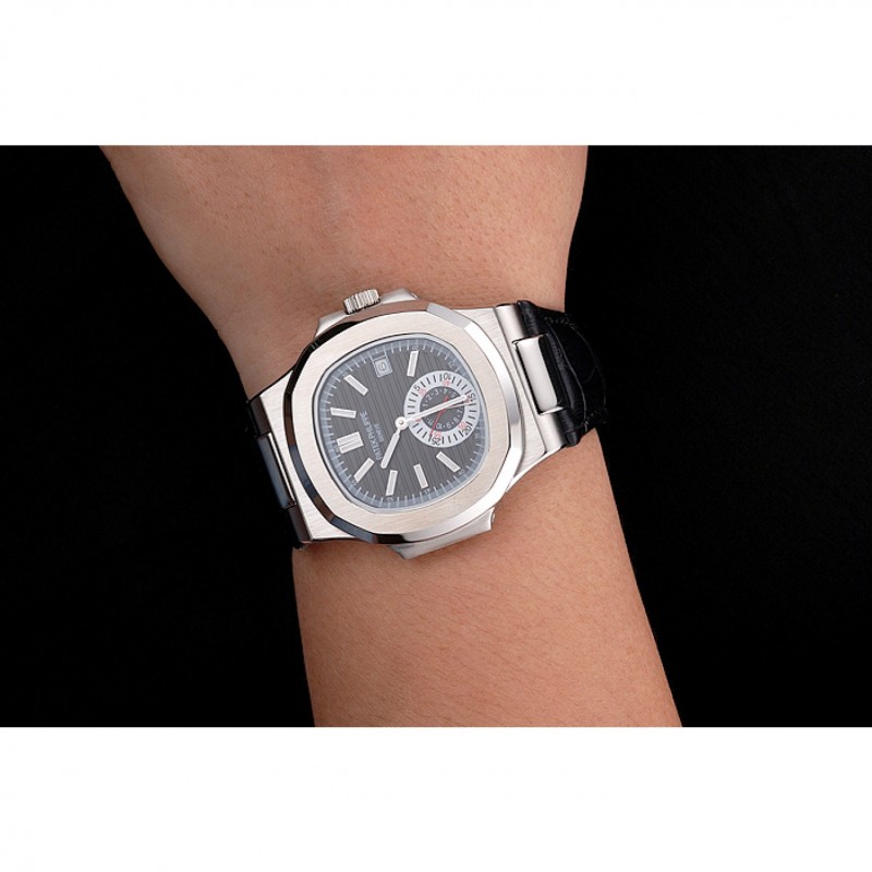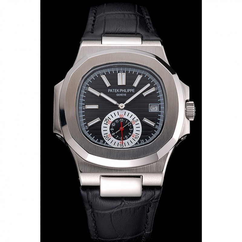 Barato Patek Philippe Nautilus Negro Dial correa de cuero caja de acero inoxidable Negro