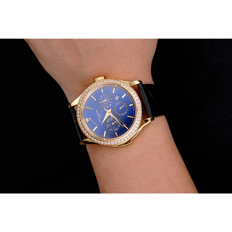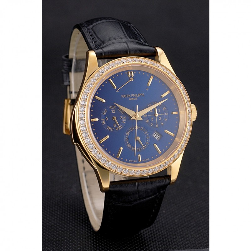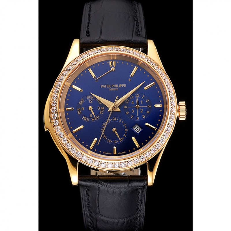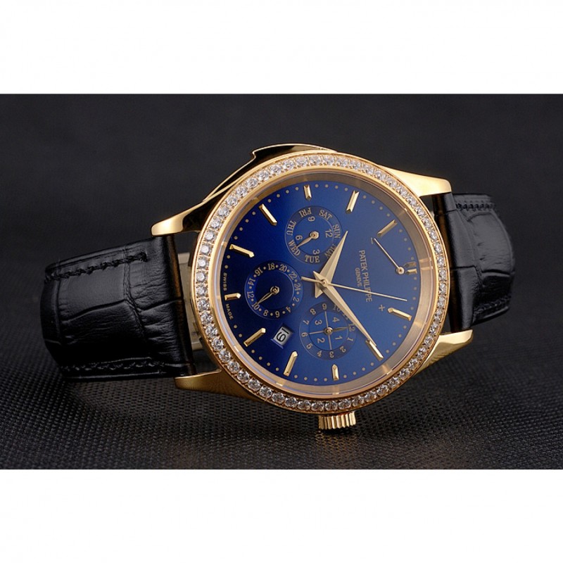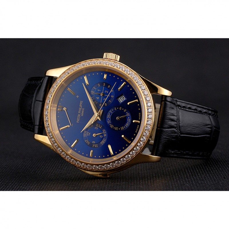 Barato Réplicas Relojes Suizo Patek Philippe Grand complicaciones Calendario Perpetuo Dial correa de cuero azul Bisel De Oro Diamante Negro