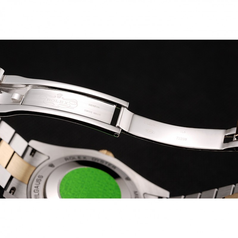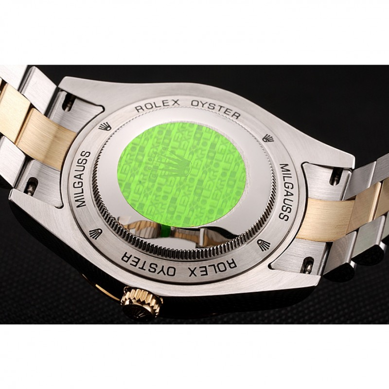 Volver: Rolex Oyster Milgauss grabado inoxidable pulido de acero de resorte en la parte trasera con Rolex etiqueta de autenticidad verde
