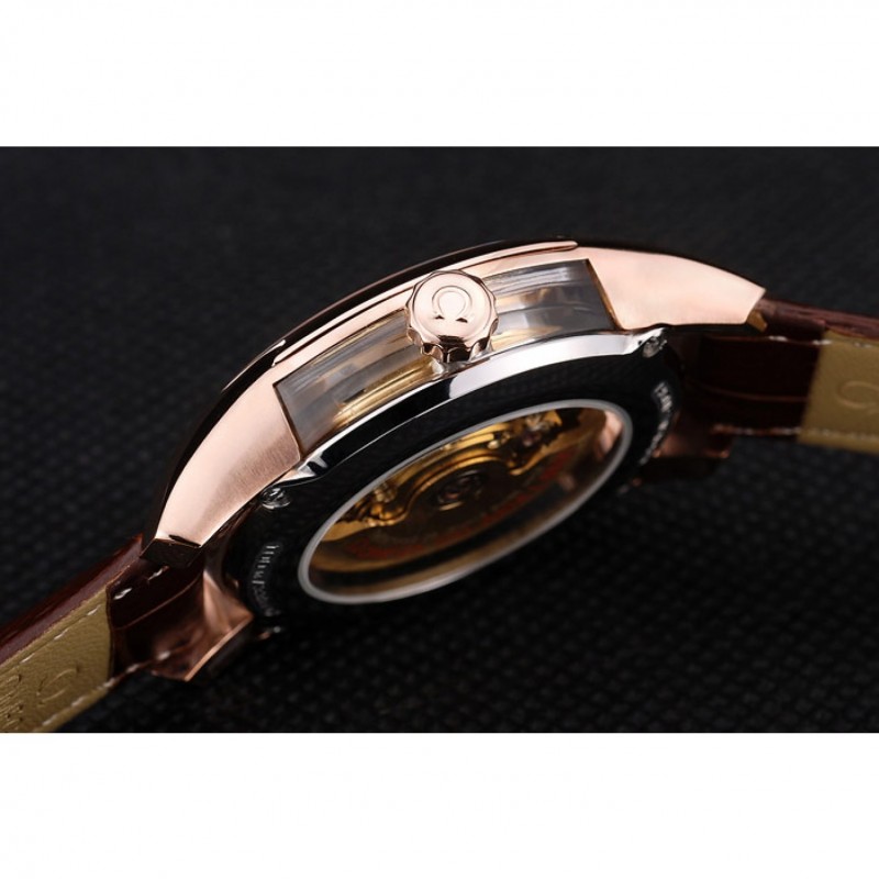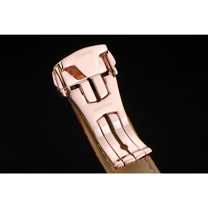 pulsera: Brown correa de piel de cocodrilo con relieve de calor Omega, el logotipo y código de producto y un grabado 18k logotipo de oro rosa plateado plegable en el corchete del gancho de liberación empuje