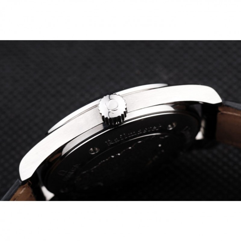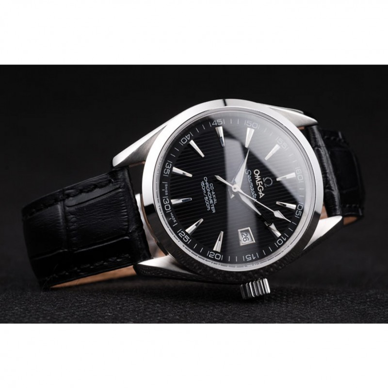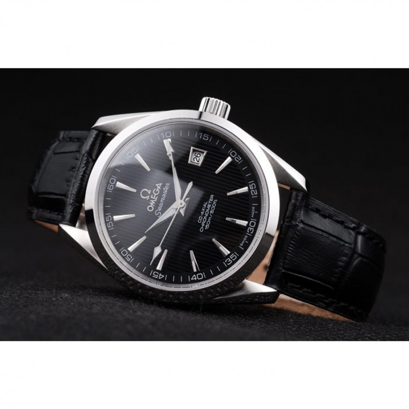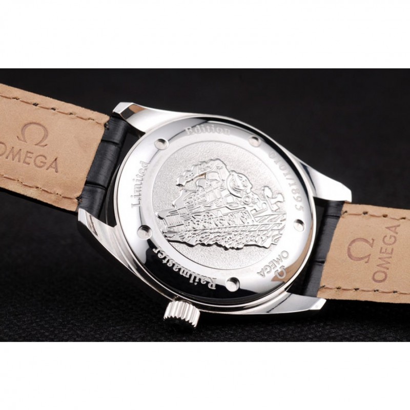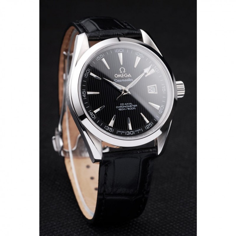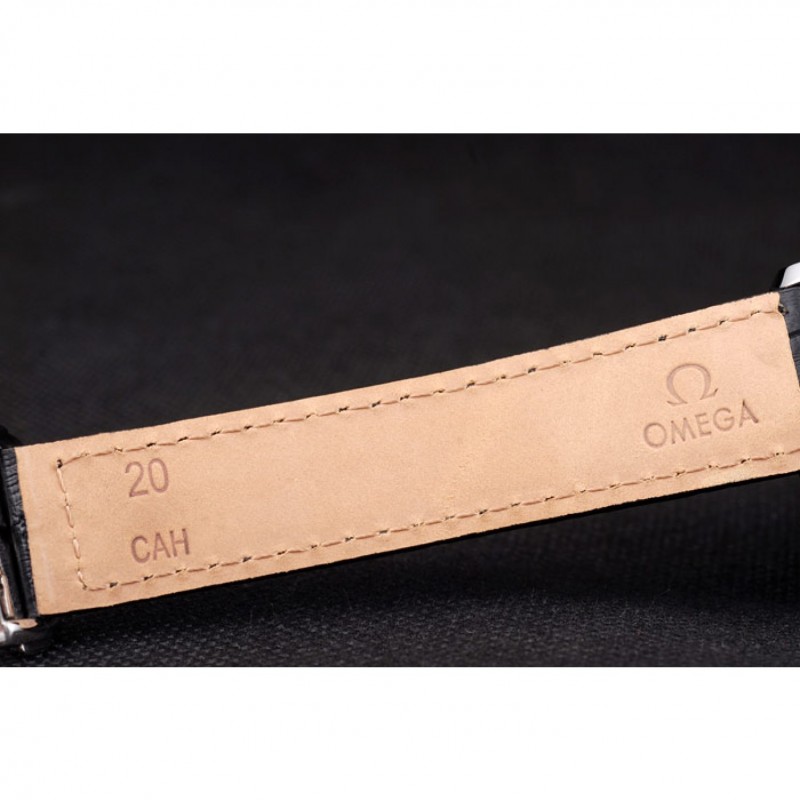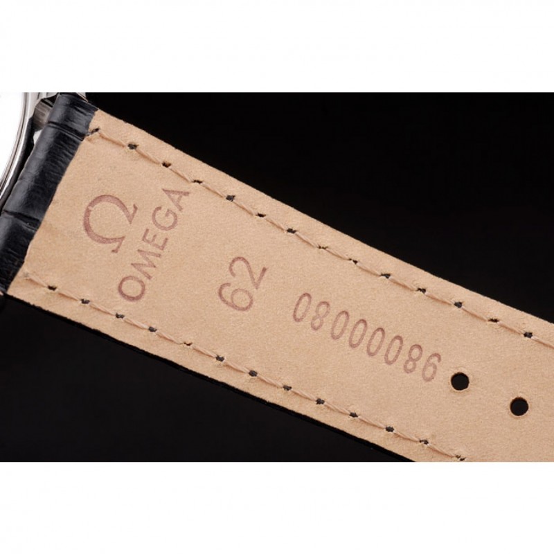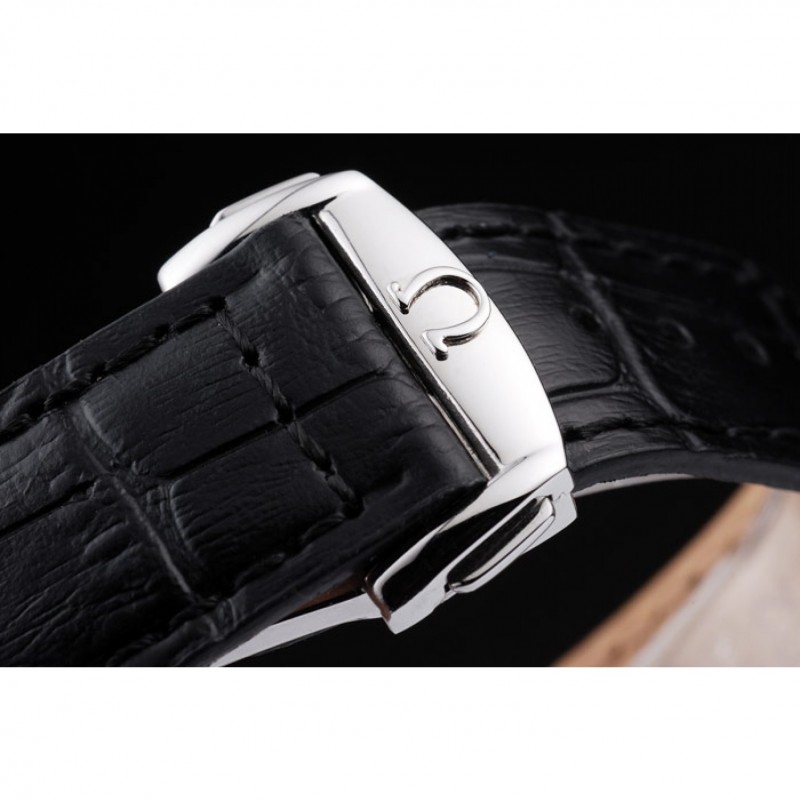 pulsera: correa de piel de cocodrilo Negro con el calor en relieve sello de Omega y acero inoxidable plegable en el corchete con el logotipo de Omega en la parte superior